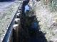 | 澄んだ秋空の下、刈り取られたばかりの新しい藁が残る田んぼの横の小川
